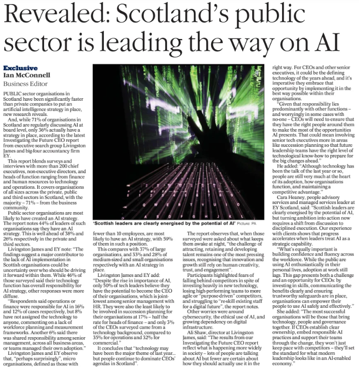 Ahead of the public launch of our latest Future CEO survey on Monday, The Herald has shared a sneak peak of some of our key findings. You can read the full article in the Herald here: Scotland’s public sector ahead of private firms on AI.