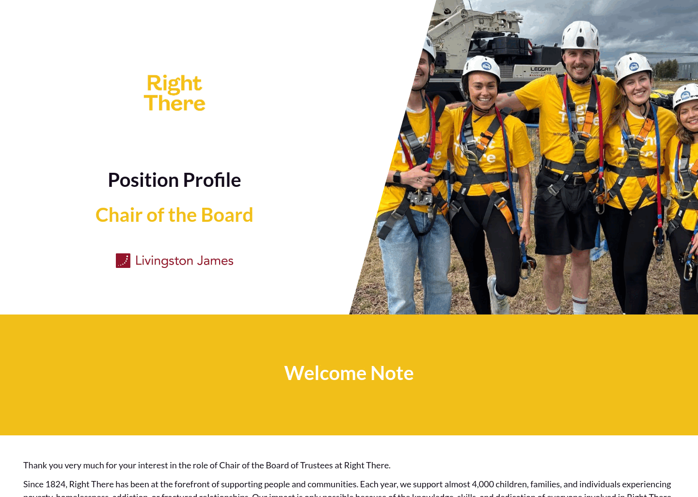 Right There is a unique organisation, full of committed people inspired by our values and the mission to create positive change. As Chair, you will play a central role in supporting a highly motivated and passionate Board of Trustees and senior leadership team to safeguard the organisation’s vision, strengthen its impact, and ensure it thrives for the future.