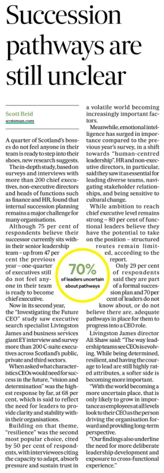 Highlights from Livingston James’ latest Future CEO report, produced in association with EY, were featured in an exclusive article by The Scotsman. The study draws on insights from more than 200 senior leaders across the public, private, and third sectors, and shows significant shifts in leadership expectations.